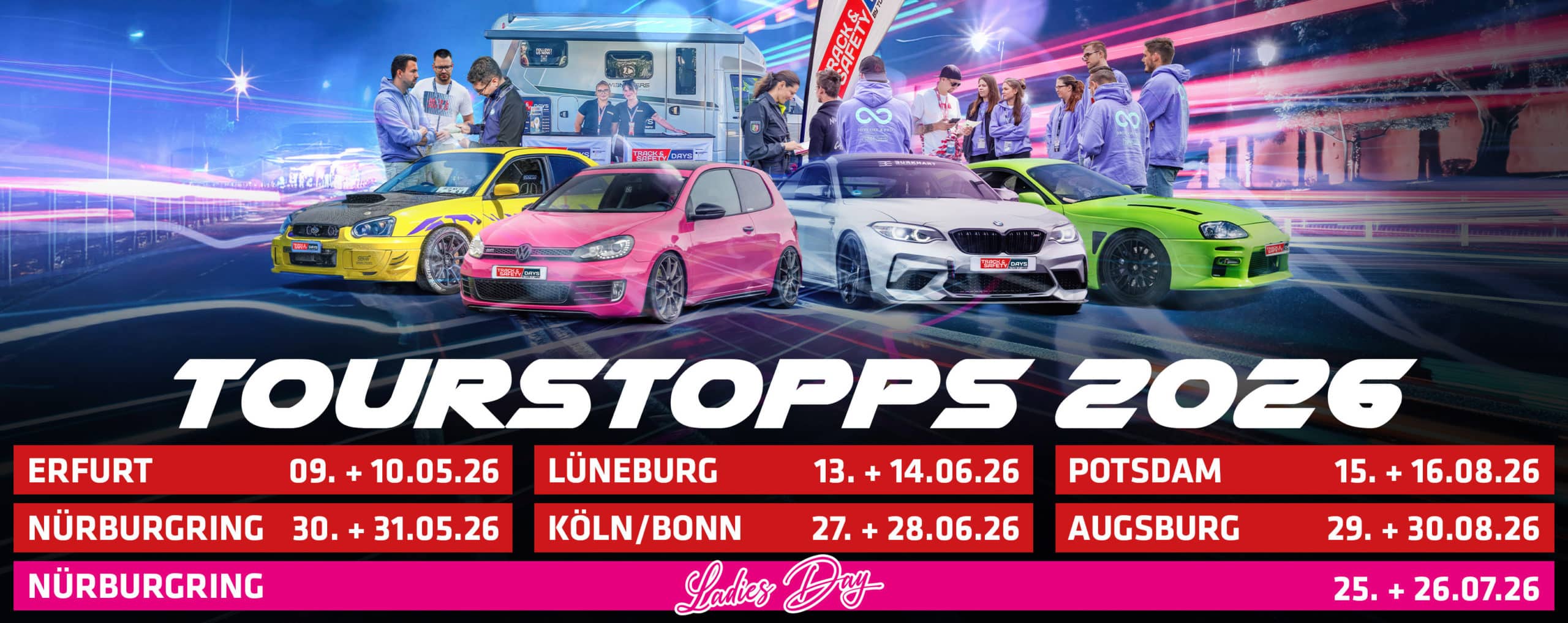 Junge, Tuning-begeisterte Fahrerinnen und Fahrer, die Ihr Fahrzeug technisch verändert haben, können sich für einen der Standorte bewerben. Die Track & Safety Days finden bundesweit in Fahrsicherheitszentren statt. Für lediglich 25 Euro Teilnahmegebühr gibt es Workshops mit Tuning Experten, Fahrtrainings mit zertifizierten Fahrtrainern, ein Welcome-Package und Benzin-Gespräche.